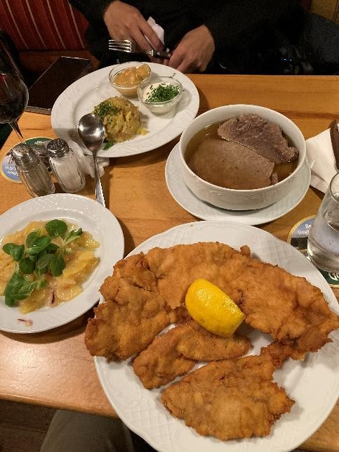 帰りに名物のシュニッツェル(豚の薄揚げ)とターフェルシュピッツ(牛肉のスープ)をいただきました。